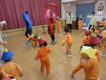 2月3日の当日は、おゆうぎ室で園長先生から節分の話を聞き、❝まめまき❞の歌を歌った後に鬼が登場!!